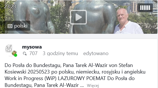 Между тем, за 72 года своей жизни я никогда ничего и никого не рекламировал, ни для Facebook, ни без нужды, ни ради личной выгоды. По профессии я преподаватель польского языка, журналист и поэт; В настоящее время я пишу лазурную поэму (Work in Progress, сокращенно: WiP), к которой я прилагаю следующую переписку. Majtczak’s Statement SZTUCZNA INTELIGENCJA Grok …