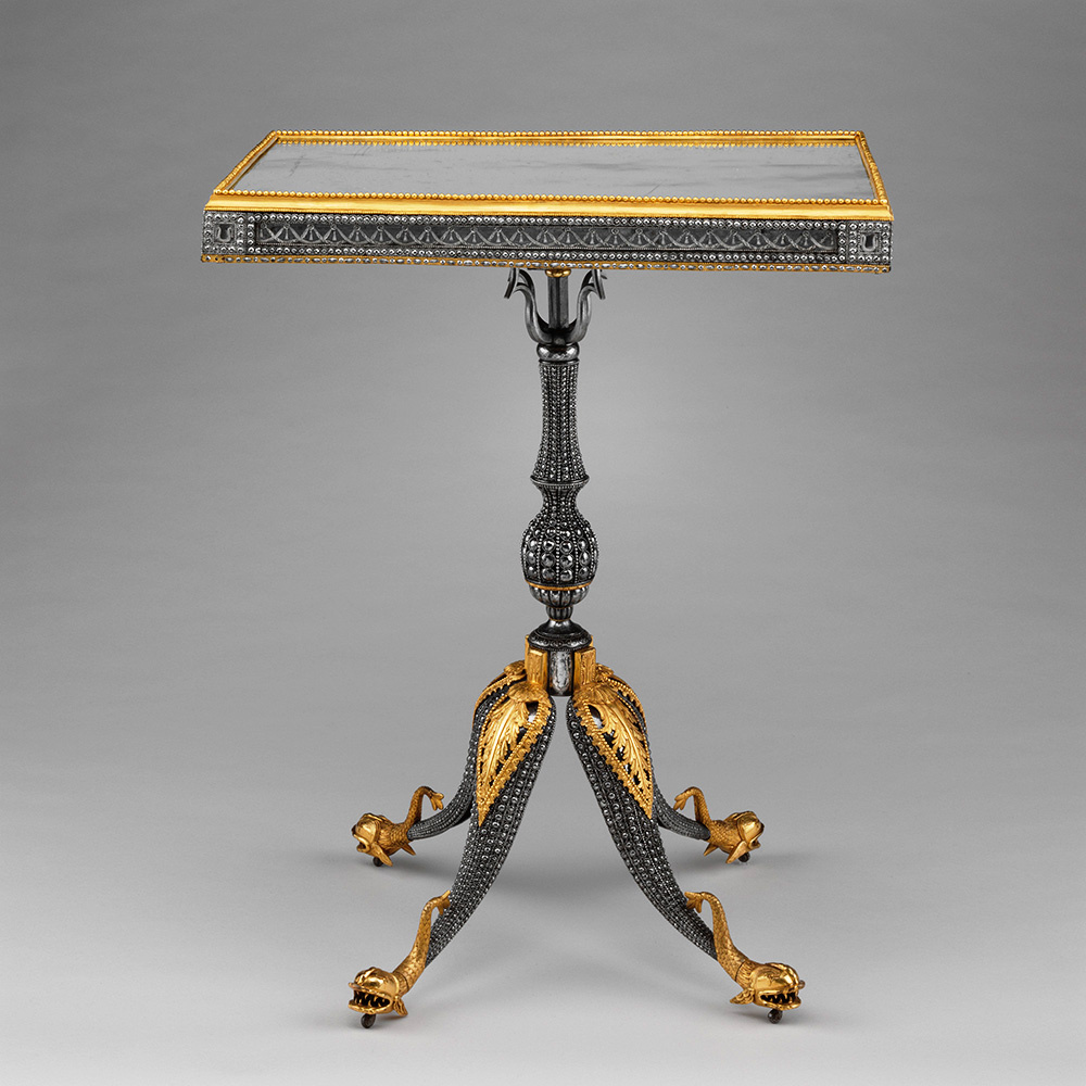Оружейная палата в городе Тула, к югу от Москвы, процветала при императрице Екатерине Великой (правила в 1762-1796 гг.), поставляя не только оружие, но и разнообразные декоративные изделия, включая драгоценные резные стальные предметы. С бриллиантовым блеском и сказочным внешним видом они являются высшим воплощением русского декоративно-прикладного искусства восемнадцатого века. Музейный стол принадлежит к небольшой группе мебели, украшенной серебряной инкрустацией, орнаментальным травлением и позолоченными аппликациями, которая суммирует почти все техники, применяемые тульскими мастерами. Вероятно, единственный известный пример за пределами России (сегодня стол находится в Метрополитен-музее в Нью-Йорке), этот стол визуально является наиболее совершенным из всех. Предметы столь внушительного качества покидали Россию в основном в качестве дипломатических подарков или как часть императорского приданого. Однако недавние исследования показывают, что этот необычный парадный стол (предназн