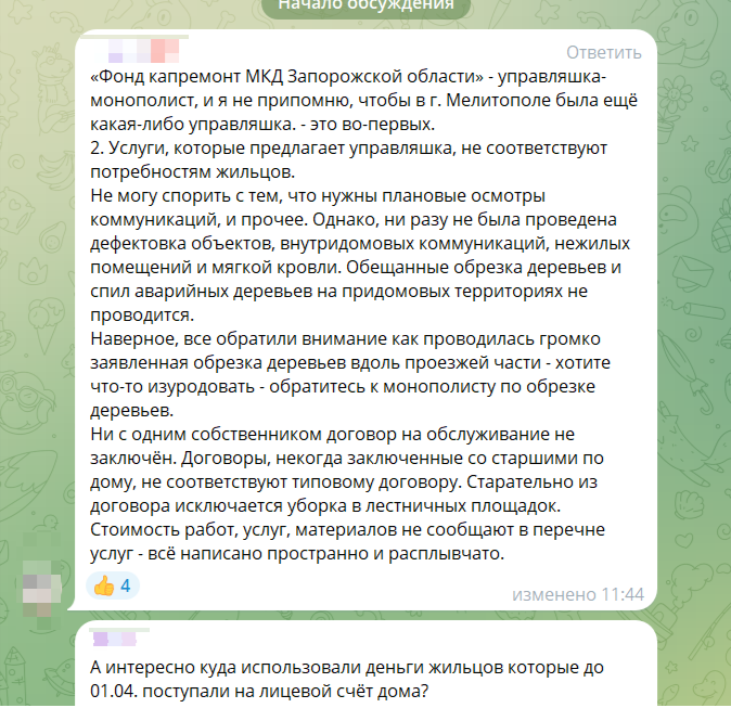 После нашей публикации о необоснованно повышенных коммунальных тарифах поднялся резонанс. Оказалось, что вопросов о новых начислениях от Фонда капремонта ещё больше, чем представлялось ранее. Сегодня, 23 мая, начальник «Фонда капремонта МКД Запорожской области» Андрей Хрущ ответил на обращения местных жителей, упустив главное. Этот ответ, как выяснилось, стал буквально солью на рану. В комментариях под видео с объяснениями от начальника Фонда капремонта разгорелись споры. Жители региона надеялись на исчерпывающие ответы о том, на чём же всё-таки основываются эти тарифы и почему нет возможности выбрать частную управляющую компанию, как способ управления МКД. Один из главных вопросов, пока оставшийся без ответа - об инвентаризации домов. Как пишут наши читатели, активности от коммунальщиков возле домой они не заметили - соответственно не определена ни степень износа дома, ни состояние общедомового имущества. А кроме того, запорожцы отметили, что обрезка и спил деревьев на придомовых терр