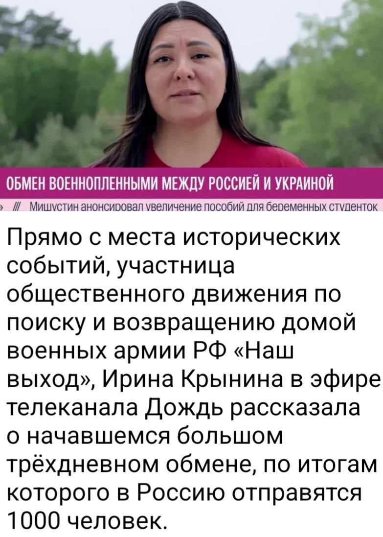 Участница т.н. "общественного движения по поиску и возвращению домой военных армии РФ" (украинский проект, играющий на чувствах родственников российских военнопленных) признала масштабный обмен, иницированный Россией в рамках стамбульских переговоров - историческим событием. При этом, наши переговорщики неоднократно говорили, что Россия готова на большие и равноценнве обмены. И благодаря упорству наших переговорщиков и снисхождения Киева в проведении обмена "1000 на 1000", тысячи родственников снова увидят своих родных. И согласившись Киев раньше на массовые обмены, это событие наступило бы ещё раньше и возможно приобрело постоянный гуманитарный характер. @iperiodu| @iperiodu_ru x @iperiodu_ua| Подписывайтесь
