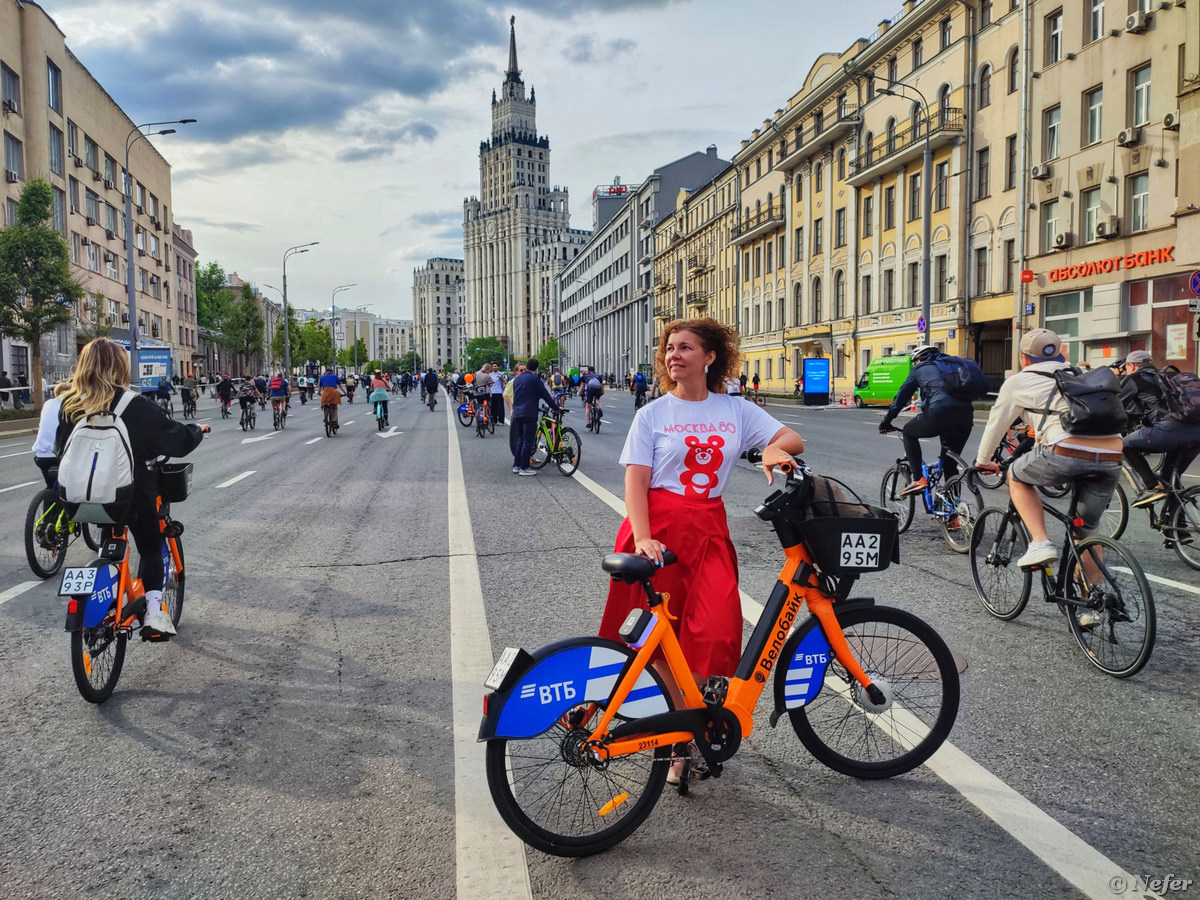 А я ведь участвовала в весеннем велофестивале. Не успеваю вам все рассказывать, слишком много событий. В этот раз был стандартный маршрут: 15,5 километров по Садовому кольцу. Говорят, было 67 тысяч участников. Местом старта была обозначена Зубовская площадь. Наученные горьким опытом, мы поехали не до Парка Культуры, а до Фрунзенской, чтобы попасть сразу ко входу в стартовый городок. В прошлом году на старте был ад, с тех пор возникла идея разделять время начала заезда на интервалы: 15:00, 16:00 и 17:00. Подумала, что все захотят в первый слот, предложила зарегистрироваться во второй. В реальности выехали позже. Я была в восторге от осеннего велофестиваля. В этот раз организация подкачала, было много недоработок. Ну, во-первых, проблемы с прокатом велосипедов. Велобайк подготовился, натащил аккумуляторов, они рассчитывали, что люди будут приезжать, сдавать велосипеды, а следующие участники будут их брать. Да, но нет. Народ бросал велики на финише, потому что дальше их просто не пускали.