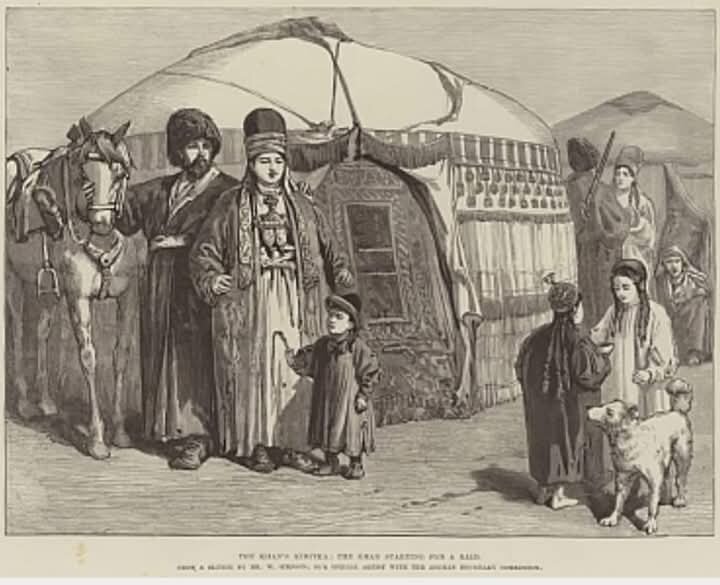 Кибитка (юрта) делается из тонкого леса и кошмы, на него натянутой. Цена обыкновенной от 30 до 100 руб. серебром. У хана Джангера кибитка стоила более 3,000 руб. серебром. Деньги есть принадлежность немногих; богатство же составляет число скота, количество одежд и запасных материй. Это делает состояние киргиза до того шатким, что одна зима может превратить бая в совершенного байгуша. Я имел тамыра. Познакомились мы осенью 1846 года. Тогда у него было ди 800 добрых лошадей, более. 4,000 баранов, много рогатого скота и верблюдов. Весной в 1847 году тамыр пришел ко мне в Ставку и рассказал с совершенным хладнокровием свое несчастье. Вот что случилось. Он с однородными зимовал в камышах Каспийского прибрежья. В конце февраля сделалась продолжительная оттепель, так что киргизы обманулись и сочли это началом весны. Откочевали они от прибрежье дня на три хода. Недели не привелось прожить им на новом месте, как ударил градусов в 20 мороз, пошел снег, подул сильный ветер и поднялся буран