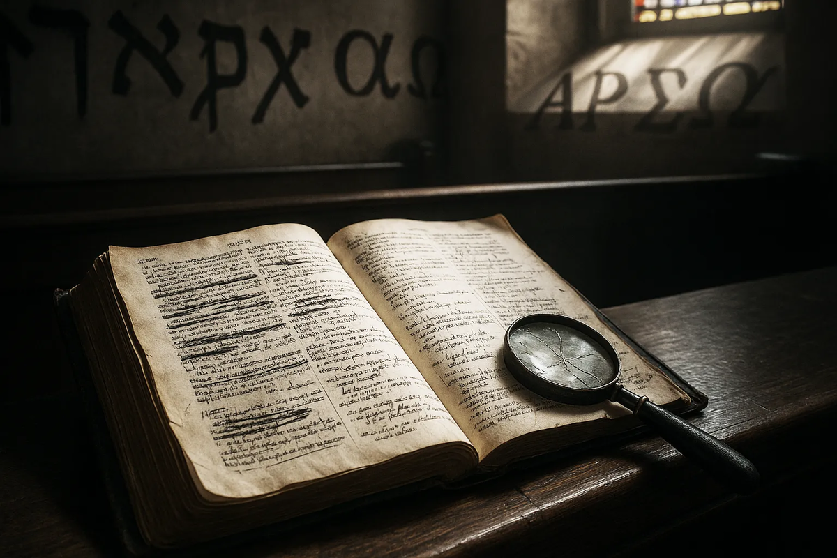 Открытая, потрёпанная Библия лежит на тёмной деревянной скамье в церкви. Её страницы исписаны ручкой и частично зачёркнуты. Рядом — треснувшее увеличительное стекло, а свет, падающий из витражного окна, отбрасывает драматические тени еврейских и греческих букв на каменную стену позади.
