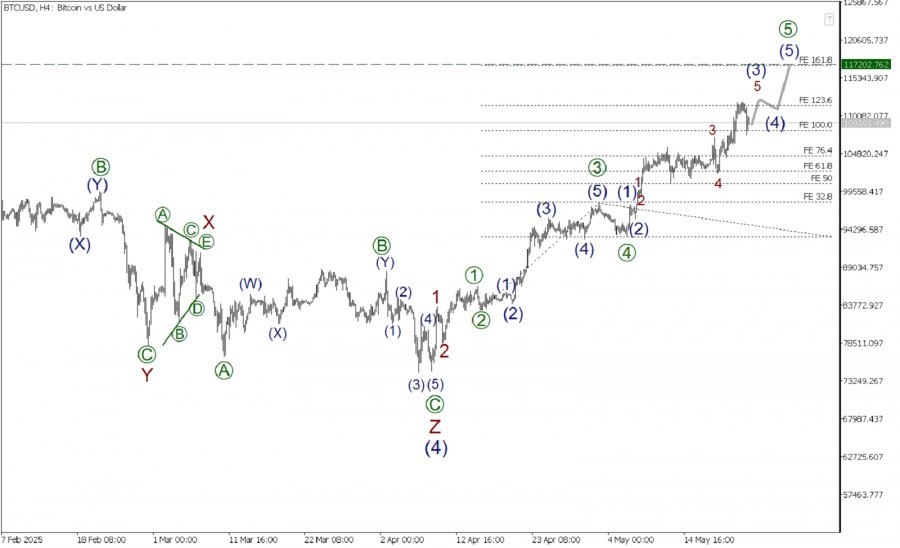 https://basechop.ru/wordpress/?p=43906 В глобальной перспективе по Биткоину может формироваться крупный бычий импульс (1)-(2)-(3)-(4)-(5). Скорее всего, первые четыре части импульсного паттерна полностью завершены. То есть имеются ввиду волны (1)-(2)-(3)-(4). Коррекционная волна (4) приняла сложную форму тройного зигзага. На последнем участке графика мы можем наблюдать построение начальной части заключительной импульсной волны, которая будет состоять из подволн 1-2-3-4-5. На текущий момент полностью завершенными смотрятся первые две небольшие подволны 1 и 2. В настоящее время может формироваться подволна 3. По всей видимости, уже построены ее подволны [1]-[2]-[3] и коррекция [4]. Сейчас формируется завершающая импульсная подволна [5]. Внутри импульса [5] ожидается рост цены в рамках подволны (3). Затем почле небольшой коррекции, рост может продолжиться к отметке 117202.76. На указанном уровне величина подволны [5] составит 161.8% по расширению Фибоначчи от импульса [3]. Торговые…