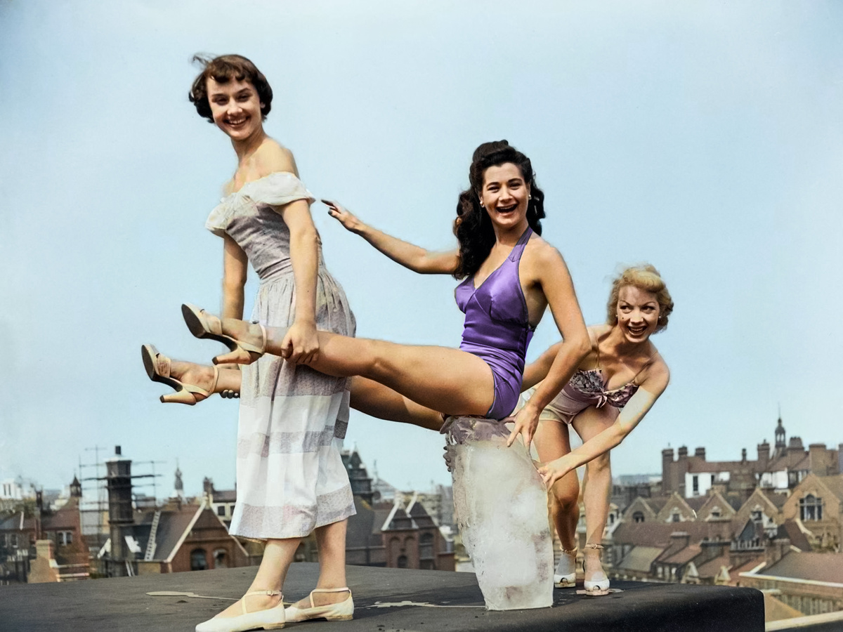 Хористки из спектакля "Соус тартар", среди которых Одри Хепберн (слева), на крыше Кембрижского театра с глыбой льда. Лондон, 1949 год.