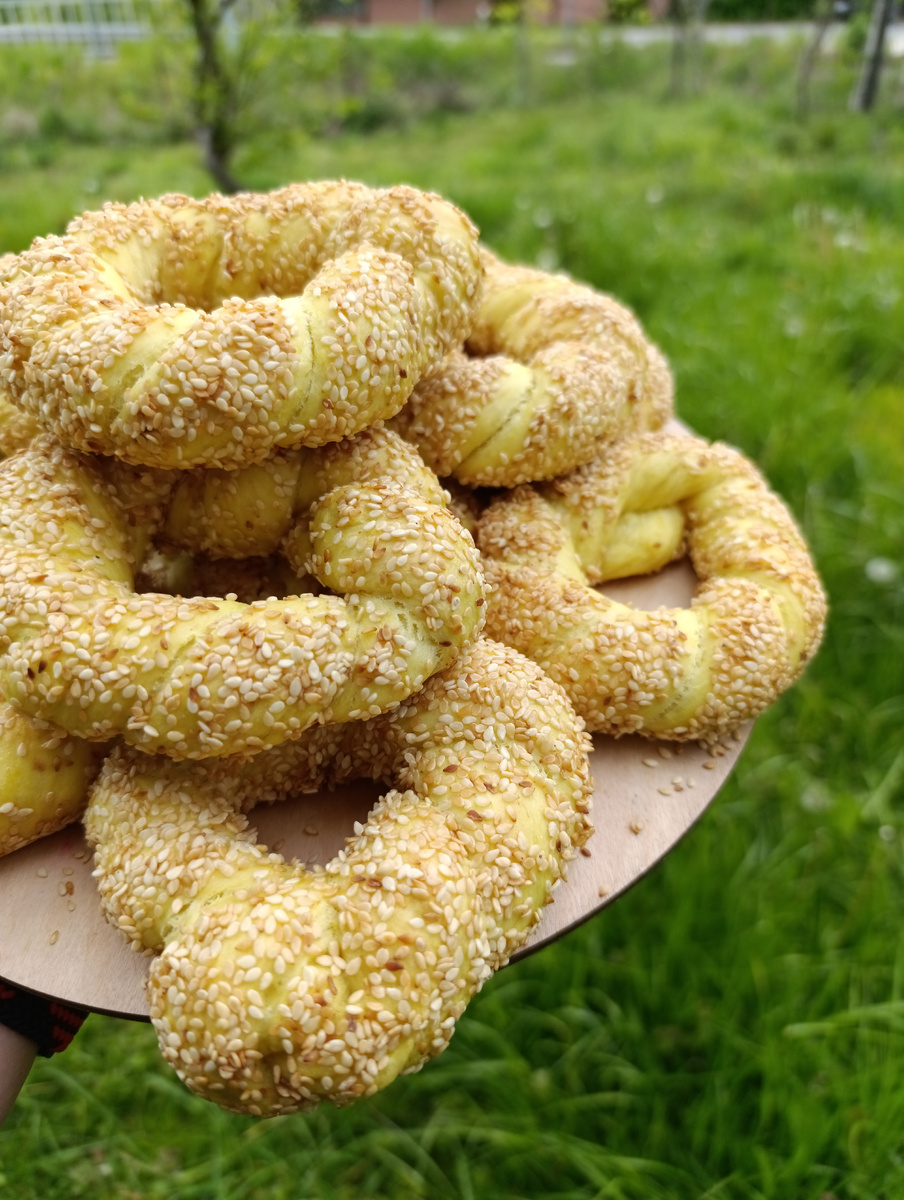 Нежные, мягкие, ароматные бублики с кунжутом - полноценный многогранный вкус, и многообразие вариантов использования... Разрежьте бублик вдоль , смажьте творожным сыром , добавьте пару ломтиков слабосолёной красной рыбки, и вот у вас уже сытный завтрак, а если смазать бублик нутеллой или домашним вареньем, то у вас будет вкусный и простой десерт. Для порции из 12 штук , нам понадобиться : - 750 гр муки - 60 гр сахара - 10- 12 гр сухих дрожжей ( 1 маленький пакетик ) - 65 мл растительного масла - 400 мл воды - 3 щепотки соли Для обвалки: - 100 гр обжаренного кунжута Для сиропа: - 2 ст.л. меда - 200 мл теплой воды Приготовление: 1) Для начала приготовим тесто. Для этого сначала распустим дрожжи с сахаром в теплой воде. Пусть они немного постоят и разойдутся (~10 мин). Все остальные ингредиенты можно сразу закинуть в чашу миксера или в тару, в которой вы собираетесь вымешивать тесто. Затем добавляем воду с дрожжами и хорошенько вымешиваем тесто, оно в меру мягкое, не крутое, но и