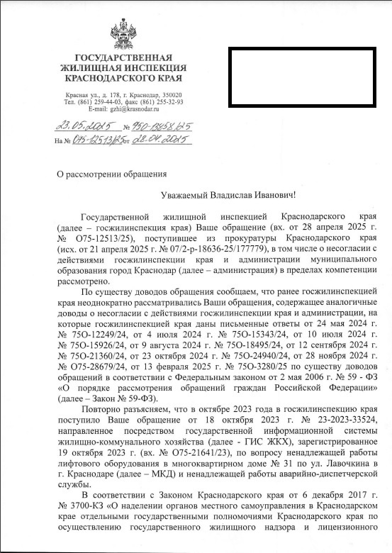 Жалоба в ГП РФ от 23 мая 2025 г. по факту получения внеочередной отписки от врио исполняющего обязанности руководителя госжилинспекции края Ю.А. Шеян от 23.05.2025 №750-13855/25 на №075-12513/25от 28.042.2025
