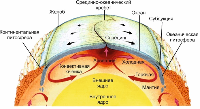 Обратите внимание, что в современном строении Земли, под дном океана, между внешним ядром и литосферой, в мантии есть магматические конвективные ячейки. Существованием этих конвективных ячеек, в которых происходит круговорот магмы, объясняется подвижность всей системы. Объясняется: как поднятие и выход магмы (апвеллинг); расхождение срединно-океанического хребта (спрединг); и опускание океанической литосферы (субдукция).