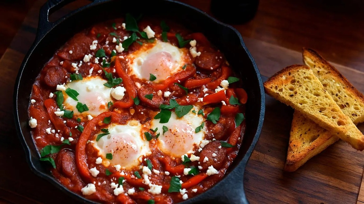 Представьте аромат поджаренной колбаски, томящейся в густом томатном соусе с нотками сладкого перца и тёплых специй. Сверху — рассыпчатый сыр фета и свежие травы. При первом же касании кусочка хрустящего хлеба, желток нежно растёкся, смешиваясь с соусом… Добро пожаловать в мир шакшуки по-средиземноморски! В большой сковороде на среднем огне разогрейте 1 ст. л. оливкового масла. Добавьте ломтики сырокопченой колбасы и обжарьте 3–4 минуты, до золотистого цвета. Выньте и отложите в сторону, оставив масло в сковороде. Нарежьте красный болгарский перец соломкой. Порежьте красный лук и добавьте в сковороду. Обжаривайте 5 минут до мягкости. Добавьте чеснок, копченую паприку, тмин. Готовьте 30 секунд до появления аромата. Добавьте томатную пасту и обжаривайте 1 минуту. Верните поджаренную колбасу и добавьте томаты. Приправьте солью, перцем. Тушите 8–10 минут, пока не загустеет. Сделайте 4 небольших углубления в соусе. Разбейте туда яйца. Накройте крышкой и готовьте на медленном огне 6-8 минут