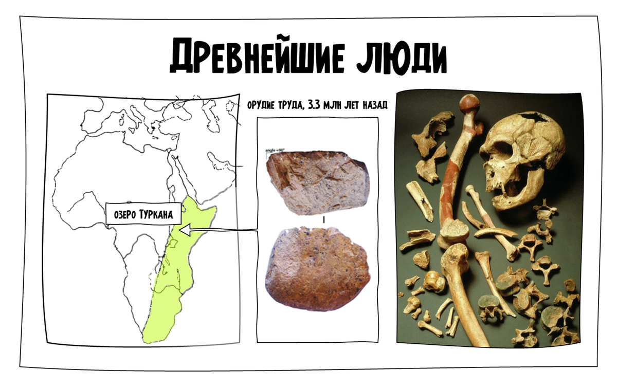 Давным давно, более двух миллионов лет назад, на востоке Африканского континента оставили свои следы древнейшие люди, первобытные. Ещё до появления письменности и городов, они познавали себя и мир. Здесь археологи находят остатки их костей и первых орудий труда — расколотую гальку с острыми краями. Такие находки многое рассказывают нам о древнейшем человеке. Древнейший человек напоминал обезьяну: грубые черты лица, надбровный валик для защиты глаз, непрямая прыгающая походка и длинные руки. Этот образ очень далёк от золотого сечения Дюрера и Цейзинга, но и с обезьяной его уже не спутать. Интересный факт: у древнейших людей отсутствовал подбородок Рацион древнейшего человека также был скромным: как и животные, наши предки занимались собирательством и охотой. Пока женщины бродили в лесах и полях в поисках съедобных даров природы — плоды, ягоды, коренья и улитки, — мужчины охотились на животных. Делали это с помощью своих изобретений: каменных топоров и дубин, которые создавали с помощью