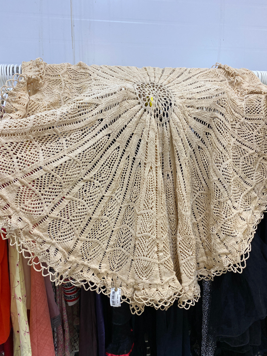 Постоянные мои читатели уже давно знают, что в сэконд-хэнд за домашним текстилем я собираюсь как на праздник😁. Посещать его стала гораздо реже, чем раньше, зато с бОльшим энтузиазмом. Здесь почти всегда очень добрые цены и выбор хороший. Идем оценивать и любоваться? Была очень красивая вязаная скатерть цвета крем-брюле. Хороша собою, на небольшой круглый стол вполне подойдет, на обычный советский, как у меня в беседке, уже будет впритычок. 1200 ее цена. С белыми вообще не задался привоз в этот раз. Завезли 50 оттенков бежевого. Такая красота, для чаепития тет-а-тет, 600₽. Но всегда можно взять за основу большую скатерть, а эту постелить сверху. Еще не скатерть, но уже не салфетка😁. У самовара я и моя Маша - я бы сдвинула ее к краю стола, поставила на нее самовар, букетик полевых цветов и по-простому угостилась чаем на закате трудового дня. 600₽ цена вопроса. Видимо, где-то на подкорке заложено у меня стремление к обуючиванию пространства вокруг себя, потому что в моем детстве в семье