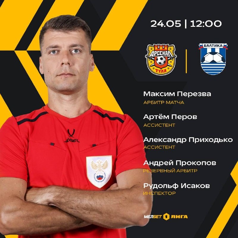 На матч «Арсенал» ⚔️ «Балтика» назначена следующая бригада арбитров: 🚩 Главный арбитр матча — Максим Перезва 🏳 Ассистенты судьи — Артём Перов, Александр Приходько 🔄 Резервный арбитр — Андрей Прокопов Инспектор — Рудольф Исаков В качестве главного судьи Максим Валерьевич работал на трех матчах «Балтики», в которых наша команда один раз одержала победу и дважды сыграла вничью. В этих встречах было показано три желтые карточки