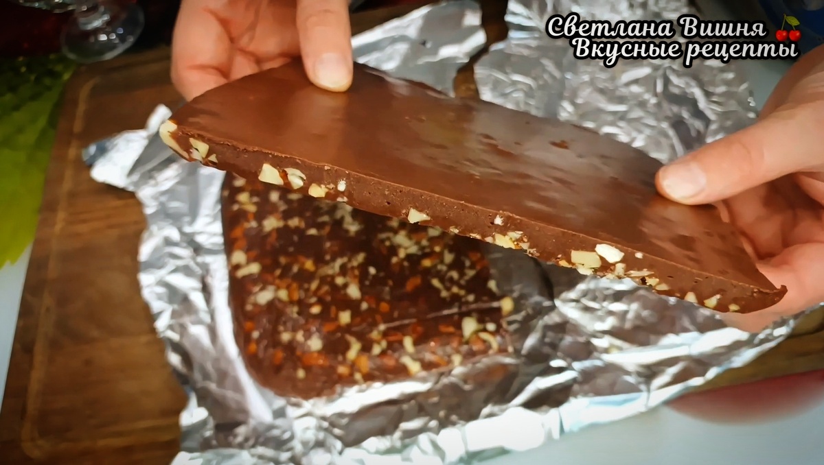 Всем привет, мои дорогие читатели и гости канала. В этой статье приготовим домашние шоколадные конфеты. Насладитесь насыщенным шоколадным ароматом и нежной, тающей консистенцией. Предлагаю вам рецепт восхитительных конфет, напоминающих молочный шоколад. Вместо орехов можно экспериментировать с другими начинками, и получить неповторимый вкус! Сахар – 240г. Чистая вода – 80 мл. Сухое цельное молоко – 130г. Какао-порошок – 60г. Сливочное масло высшего качества – 65г. Любые орехи на ваш вкус – 100г. Растительное масло Фольга пищевая 1. Орешки подсушиваю несколько минут на среднем огне. Я использовала миндаль. Произвольно измельчаю ножом. 2. Конфеты буду делать в ёмкости для запекания прямоугольной формы. Выстилаю фольгой, смазываю небольшим количеством растительного масла без запаха. 3. Распределяю подготовленные орехи. Орехи можно измельчить в чаше блендера. 4. Смешиваю какао и сухое молоко. 5. В небольшую кастрюлю с толстым дном высыпаю сахарный песок и заливаю его водой. Пере