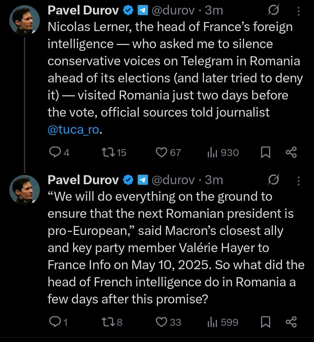Павел Дуров продолжает раскрывать детали возможного вмешательства Франции в президентские выборы в Румынии. По его словам, глава внешней разведки Франции Николя Лернер лично обращался с просьбой заблокировать консервативные телеграм-каналы в Румынии, а за два дня до голосования прибыл в страну — якобы для «наблюдения». Дуров сопоставляет визит Лернера с недавним заявлением Валери Айе — союзницы Эммануэля Макрона — о том, что «будет сделано всё, чтобы новый президент Румынии был проевропейским». Получается странное совпадение: сначала политическое обещание на уровне ЕС, затем визит разведки с попыткой давления на платформу. Если эти данные подтвердятся, ситуация вполне может перерасти в международный скандал с участием Telegram, Румынии и французских спецслужб.