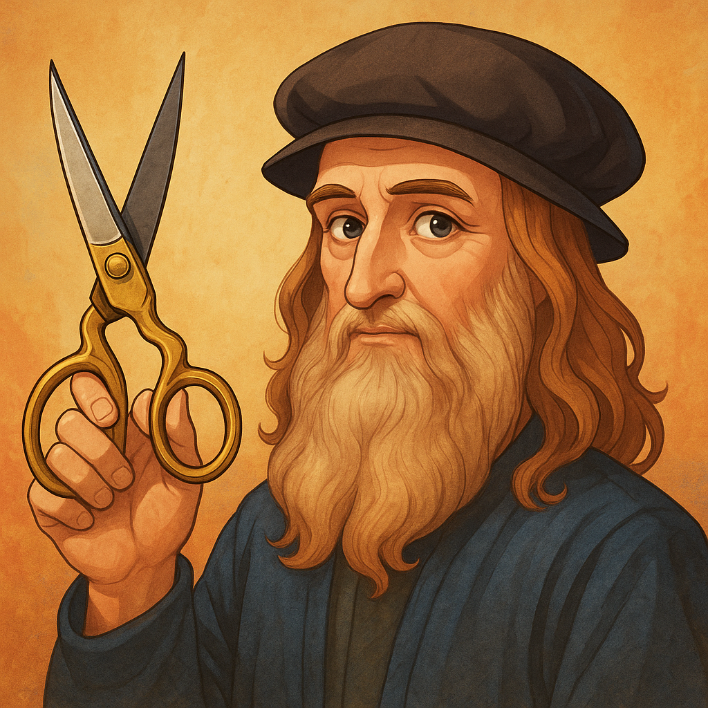 Ну это уже перебор. Леонардо да Винчи — человек, который, кажется, успел изобрести всё. Картины, вертолёты, подводные лодки... и ножницы? Да, есть мнение, что именно он придумал ту самую конструкцию с двумя лезвиями, которая до сих пор лежит у нас в кухонном ящике. Леонардо не был узким специалистом. Он был всепоглощающим умом. Ему было интересно буквально всё: как работает тело, как летает птица, как закипает вода, и — да — как сделать идеальный инструмент для резки. Потому что резать приходилось часто: ткани, бумагу, кожу, да хоть волосы. До Леонардо были устройства, которые как бы намекали на ножницы: металлические петли с пружиной, которыми резали ткань в Древнем Риме. Но настоящих ножниц, где два лезвия сходятся на шарнире, чтобы давать ровный срез, ещё не было. Именно такую конструкцию описал (и, возможно, собрал) Леонардо в своих чертежах. Подумаешь, ножницы. А теперь представьте: вы — портной эпохи Возрождения. У вас куча ткани и один нож. Всё неудобно, криво, больно. И тут —