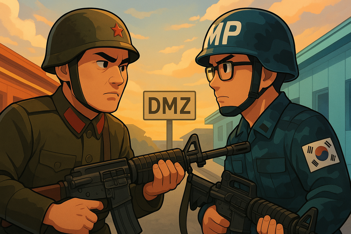 Ну вы поняли… Весь мир давно живёт в 20-х годах 21 века, а на Корейском полуострове — до сих пор 1953 год. Потому что, внимание: Северная и Южная Корея технически всё ещё в состоянии войны. Да-да, мирный договор между ними так и не подписали. Только перемирие. И то — временное. Уже больше 70 лет. Всё началось в 1950 году, когда Север напал на Юг. Началась Корейская война. Кровавое, жестокое, беспощадное месиво, в которое влезли США, Китай и ещё полмира. В 1953 году стороны подписали соглашение о прекращении огня. Не мир — просто "давайте не стрелять пока что". С тех пор этот «пока что» длится. Между двумя Кореями — Демилитаризованная зона (ДМЗ). 4 километра нейтральной территории, которая охраняется, как ядерный сейф. Солдаты с обеих сторон стоят лицом друг к другу, между ними — линия из бетона. Там даже птицы летят с осторожностью. Это одно из самых напряжённых мест на планете. И самое ироничное: называется «демилитаризованной», хотя напичкано военными с ног до головы. Южная Корея —