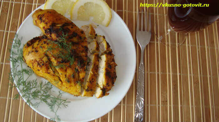 Но я приготовила ее чуть менее полезным, но более аппетитным способом. В таком виде куриную грудку можно употребить и на обычный обед, и поставить на праздничный стол. Грудка получится нежной, ароматной, но поскольку это нежирная часть курицы, мясо будет суховатым. Поэтому советую, к запеченной в духовке грудке подавать соус. Только не кетчуп из магазина. Приготовьте свой, самый несложный и вкусный, например, бешамель сливочный или томатный. Потратите на 10 минут больше времени, зато получите прекрасное дополнение к куриному мясу Ингредиенты на 4 порции мяса: На классический соус бешамель: 1. Грудку освободить от шкуры, поместить на час-два в подсоленную воду. На литр воды — 2 ч. л. соли. Можно оставить гру