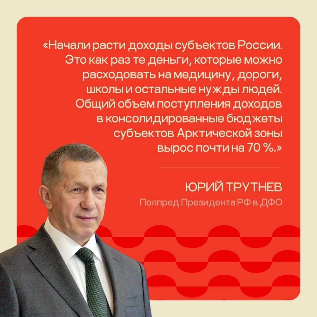 Юрий Трутнев выступил с докладом в Государственной Думе в рамках «правительственного часа» «Сегодня в Арктической зоне Российской Федерации реализуются сложные добычные проекты, строятся высокотехнологичные предприятия, закладываются на верфях новые атомные ледоколы. Все это – результат большого труда людей», – отметил Юрий Трутнев. Главное: - В Арктике создана самая большая в мире особая экономическая зона. Здесь реализуется более тысячи инвестиционных проектов с общим объемом инвестиций более 2 трлн рублей. - За последние 5 лет в рамках реализации национальных проектов и единой президентской субсидии в Арктике построено более 60 новых больниц и поликлиник, 48 школ и детских садов, 17 спортивных центров. - Северный морской путь, развитие которого создает условия для реализации планов производственной деятельности таких компаний, как «НОВАТЭК», «Газпром», «Норникель», «Лукойл». Уплаченные этими компаниями налоги обеспечат создание новой налоговой базы в объеме 13 трлн рублей к 203