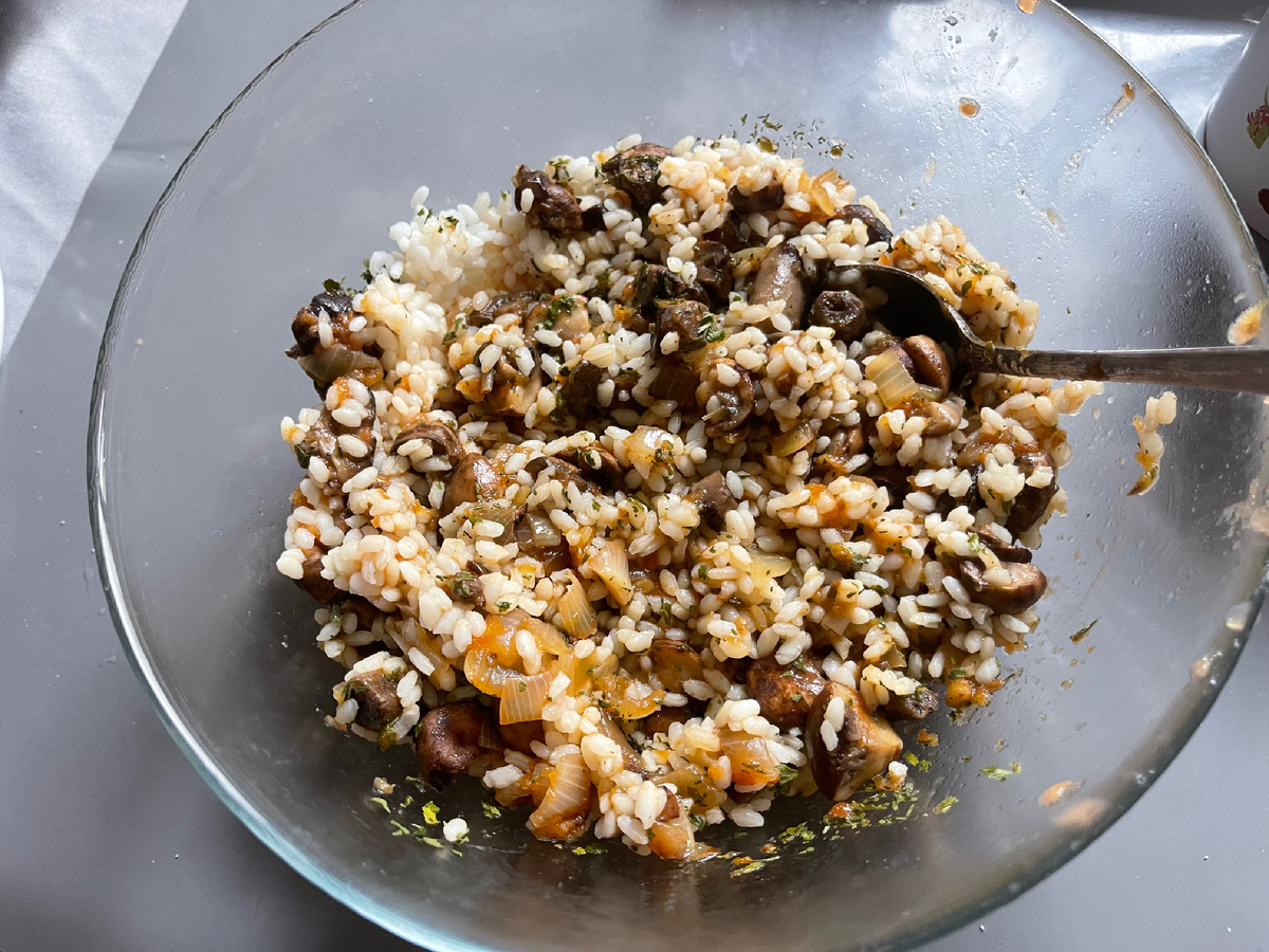 для грибной начинки: 400гр Грибов, 75гр. сырого риса, крупный помидор , у меня замороженный, по 1 ч.ложке сухого укропа и Петрушки, соль, перец.