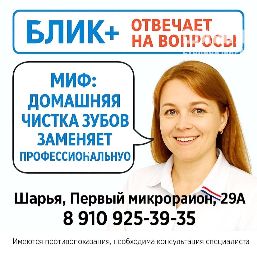 🧼 Миф №3: «Домашняя чистка зубов заменяет профессиональную» Правда: Даже при тщательной домашней гигиене невозможно полностью удалить зубной налет и камень, особенно в труднодоступных местах. Решение: Профессиональная чистка зубов методом Air Flow в клинике «Блик+» обеспечит глубокое очищение и профилактику заболеваний десен. 📍 Шарья, Первый микрорайон, 29А 📞 910-925-39-35 По имеющимся противопоказаниям необходима консультация специалиста. Шарья – столица мира Крупнейшее городское СМИ Источник