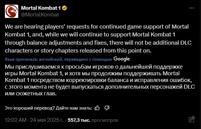 NetherRealm официально объявила о прекращении выпуска нового контента для Mortal Kombat 1. Теперь игра не будет получать дополнительных персонажей или сюжетных дополнений. Поддержка ограничится только исправлениями и балансными обновлениями. Ранее разработчики обещали долгосрочную поддержку, но сейчас все ресурсы переключаются на следующий проект, вероятно, новую игру из серии Injustice.