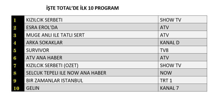 Как же стремительно меняется телевизионный ландшафт! 📊 Но одно остаётся неизменным — зрительская любовь к проверенным хитам. В этот раз редакция сайта cheek-look.ru разбирает свежие рейтинговые сводки, и, кажется, фавориты определились раз и навсегда. 😮 В Total группе *Клюквенный щербет* от Show TV снова доказал, что ему нет равных! Первое место — и это уже не сюрприз, а закономерность. Вторую ступеньку заняла программа *Esra Erol’da*, а *Müge Anlı ile Tatlı Sert* замкнула тройку лидеров. Интересно, сможет ли кто-то в ближайшее время сместить этот устоявшийся расклад? 🤔 Здесь картина почти зеркальная: *Клюквенный щербет* снова на первом месте, демонстрируя феноменальную стабильность. *Müge Anlı ile Tatlı Sert* — вторая, а вот третью позицию занял… *анонс* самого *Клюквенного щербета*! Да-да, даже краткий обзор серии обогнал конкурентов. Что это — маркетинговый ход или искренний интерес зрителей? 💥 Show TV явно празднует победу: их *Клюквенный щербет* не просто лидирует — он *правит