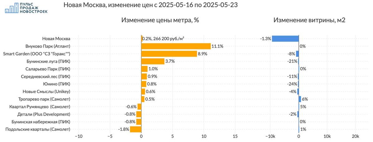 Завершаем обзор изменения цен за неделю, Новая Москва💰 Смотрим без премиум и элит классов. 💵 За 7 дней цена метра выросла на 0.2% до 266 200 рублей за метр. 📈Топ изменения цен (подорожало): 1️⃣ЖК "Внуково Парк" (Атлант) цена метра +11.1%, без изменения объема предложения 2️⃣ЖК "Smart Garden" (ООО "СЗ "Горакс"") цена метра +8.9%, витрина предложения уменьшилась на -946м2 3️⃣ЖК "Бунинские луга" (ПИК) цена метра +3.7%, витрина предложения уменьшилась на -112м2 🪫Анти топ (подешевело): 1️⃣ЖК "Подольские кварталы" (Самолет) -1.8% в цене, объем витрины при этом увеличился на 41м2 2️⃣ЖК "Бунинская набережная" (ПИК) цена метра -0.8%, без изменения объема предложения 3️⃣ЖК "Детали" (Plus Development) -0.8% в цене, витрина предложения уменьшилась на -479м2 ☄️Объем предложения жилья в регионе ниже -1.3% (-9427 м2) Все изменения в регионе на картинке, ставьте🔥если хотите посмотреть на Санкт-Петербург. 🔥 @pulsprodaj