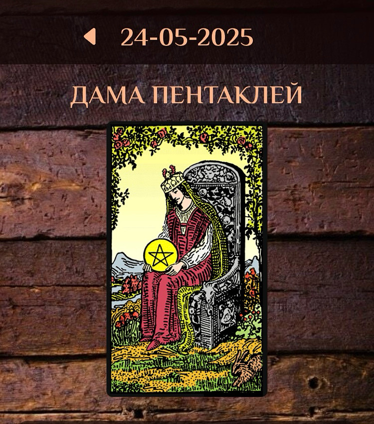 Устойчиво центрированное и дальновидное, безмятежное и защищенное. Это никоим образом не карта легкомыслия. По Королеве Пентаклей мы держим свою жизнь в порядке во всех ее материальных аспектах. Счета оплачены, сезонная одежда приобретена, дом благоустроен. Эта карта представляет душевную гармонию, творческие и созидательные способности, а также любовь к природе и земным радостям. По ней в нас нарастает реализм, выдержка, практическая сметка, способность к целенаправленным и терпеливым действиям.