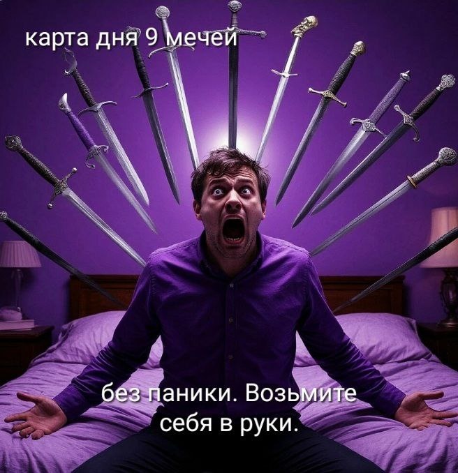 Карта дня 9 мечей День пройдет не по плану. Возможно, будет казаться, что всё валится из рук. Но на самом деле все не так плохо, все сомнения, страхи и предчувствия беспочвенны. Чтобы справиться с ними, необходимо взять себя в руки, принять ситуацию, пересмотреть планы и реализовать доступные сценарии.