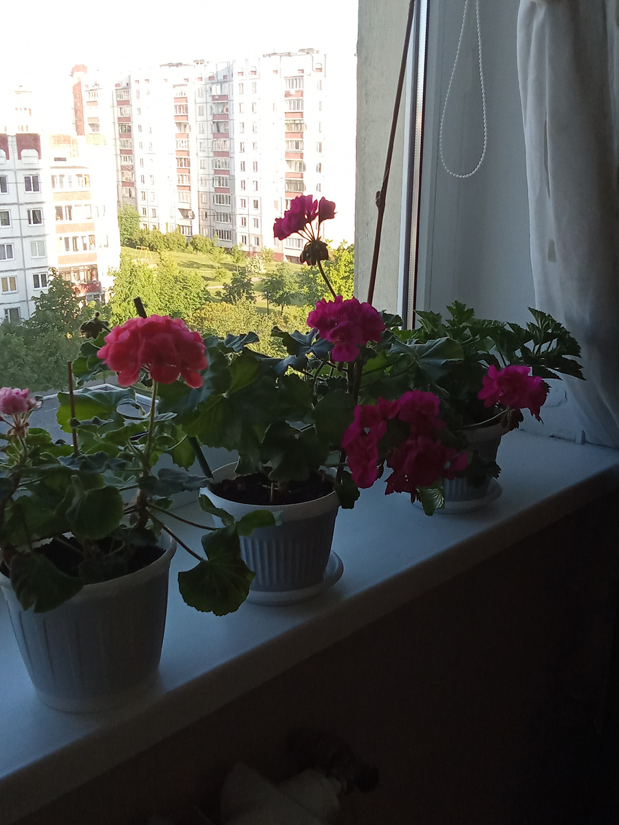Сегодня 24 мая, мой праздник, мне сегодня исполнилось 91 год. Какое - то волнение, мало спалось, приедут поздравить дети, внуки и правнуки! Готовлю кое что на стол. Сейчас 6 -30 , утро. Полила, подкормила свои цветочки и сделала фото Цветы у меня, в основном Герани простые и Королевские . Здесь тоже простые Герани. Они уже давно цветут. Это Герань Королевская. Зацветает фиолетовым цветом. У меня их больше 10 штук, многие с бутонами. Королевские Герани, многие уже с бутонами. Я периодически буду показывать свои цветы, помидоры и перцы, которые растут на моем балконе. Благодарю за внимание и желаю всем успехов и здоровья!