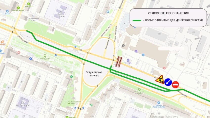 Как рассказал градоначальник, попасть на эстакаду автомобилисты смогут, сразу съехав с путепровода (он был построен ранее) через железнодорожную ветку. Проехать по данной части эстакады можно будет в направлении Северного моста. Также рядом с новой эстакадой сделали съезд, по которому можно будет проехать на Ленинский проспект и ул. Переверткина, а под ней (непосредственно на Остужевском кольце) схема движе