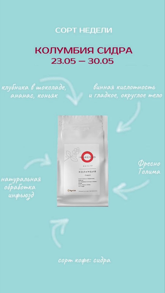 🪇 Сорт недели Колумбия Сидра – редкий микролот с невероятно чистым и сладким профилем вкуса, в котором раскрываются ноты клубники в шоколаде, ананаса и коньяка. Обработан инновационным методом инфьюзд с мосто, который придаёт лоту сложность вкусового профиля, насыщенность и выразительные фруктовые акценты. Они дарят свежие, сочные оттенки и сохраняются в долгом, сладком послевкусии.