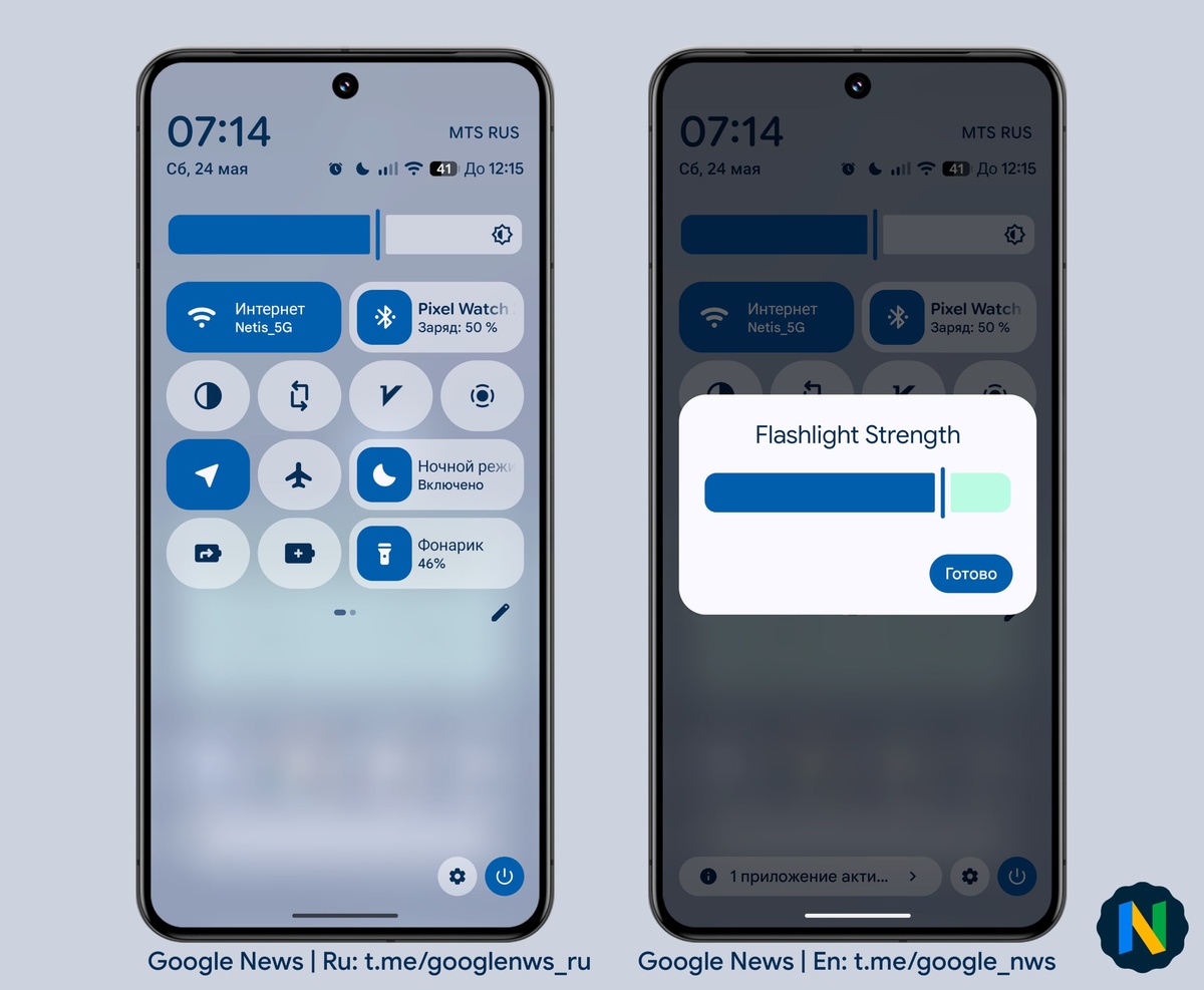 В ответ на пост Устройства Pixel наконец-то получат нативную регулировку яркости фонарика. Хотя системное API регулировки яркости фонарика существует еще с Android 13, Google применяла его разве что в Pixel Камере и приложении "Лупа". И до сих пор владельцы устройств Pixel не имели такой возможности из коробки, им приходилось загружать сторонние приложения, использующие этот API. Но вскоре ситуация может измениться, поскольку Google работает над возможностью регулировать яркость фонарика прямо из плитки «Быстрые настройки». К ней добавлено меню с ползунком интенсивности, а процент яркости отображается на самой плитке, когда она активна. Меню регулировки яркости вызывается либо нажатием на правую часть плитки (для широкого варианта), либо удержанием плитки (для укороченного варианта плитки), при этом фонарик сразу же включается. Вероятно мы увидим это изменение в Android 16 QPR1. 😎 Google News | Ru