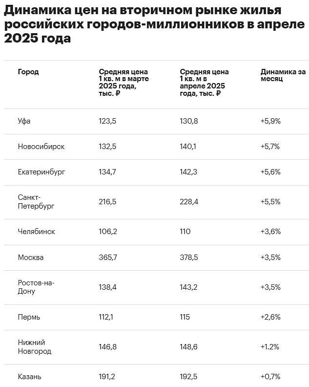 🔍 #аналитика 📈 Где вторичка подорожала больше всего? Уфа — в лидерах! Цены на «вторичку» в апреле 2025 года резко пошли вверх. Особенно — в Уфе, где средняя цена 1 кв. м выросла сразу на 5,9% и достигла 130,8 тыс. руб. 🔥 🏙 Топ-5 мегаполисов по росту цен: 1. Уфа — +5,9% (130,8 тыс. ₽) 2. Новосибирск — +5,7% (140,1 тыс. ₽) 3. Екатеринбург — +5,6% (142,3 тыс. ₽) 4. Санкт-Петербург — +5,5% (228,4 тыс. ₽) 5. Челябинск — +3,6% (110 тыс. ₽) 🏙 Москва — на 6 месте: +3,5%, средний «квадрат» уже 378,5 тыс. руб. 📉 А вот Омск, Воронеж, Волгоград и Красноярск — в минусе. В Омске цены просели сильнее всего — на 3%, до 104,6 тыс. руб. 🔍 Аналитики объясняют рост тем, что при большом разрыве между ценами на новостройки и «вторичку» — покупатели идут туда, где дешевле. И это подталкивает цены вверх. ———————————————————— 📲 Недвижимость с дисконтом от 30%: [Сайт](https://torgi-ru.ru) [ТГ-канал](https://t.me/torgi_ru_all) ———————————————————— 🏷 Теги: 🏠 #ЦеныНаЖилье 📊 #Недвижимость 📈 #Втори
