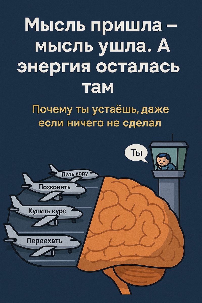 Представь, что твой мозг — это аэропорт. Каждая мысль — рейс. Ты говоришь: «Надо позвонить маме», «Записаться к стоматологу», «Сделать проект», «Заработать денег». Мозг бронирует взлётную полосу, экипаж готов, питание заказано, но самолёт так и не взлетает. Он стоит, а рядом — ещё один, и ещё, и ещё. Скоро все полосы заняты. Пассажиры (твои ресурсы) злятся, энергия на нуле, всё раздражает.