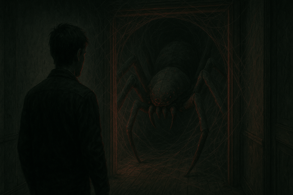 Её касание вызывало отвращение, странные дрожи пробегали по телу. Мне овладело древнее, первобытное желание убежать. То самое чувство, преследовавшее меня последние недели. Не осознавая, я начал конвульсивно дёргаться, тело пыталось рваться, но шёлк стеснял каждую конечность, и я мог лишь корчиться на полу. Я всеми силами пытался шевелить руками, зацепиться за кокон, порвать его, но безуспешно. Оставалось только уставиться на жену и огромную тень за её спиной — ту, что возвышалась над нами, густо переплетённые лапы упирались в пол и потолок.