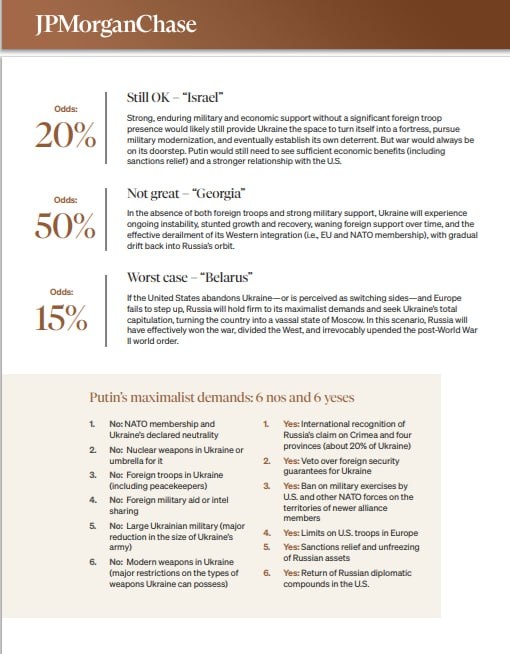 Пока Россия готовится выставить Украине свои условия перемирия, Киев работает над встречей Зеленского и Путина, а на Западе проталкивают перенос переговоров из Стамбула в Ватикан, связанный с известной инвестиционно-банковской группой влиятельный западный аналитический центр JPMorgan Chase Center for Geopolitics презентовал широкой публике тезисы своего доклада с интригующим название «Финал конфликта Россия – Украина и будущее Европы». Авторы доклада Дерек Чоллет и Лиза Сойер – не какие-то кабинетные теоретики, а люди с внушительным опытом работы в Госдепе США, Пентагоне, Белом доме, Конгрессе и так далее. Основной прогноз их прогноз состоит в том, что украинский конфликт финализируется по аналогии с корейским пятидесятых годов минувшего столетия. Аналитики называют это «лучшим сценарием» из всех возможных». Естественно, с западной точки зрения. Вероятность сценария «Южная Корея» оценивается ими в 15%. Ниже – основные параметры этого сценария. «Зеленский не добьётся ни членства в НА