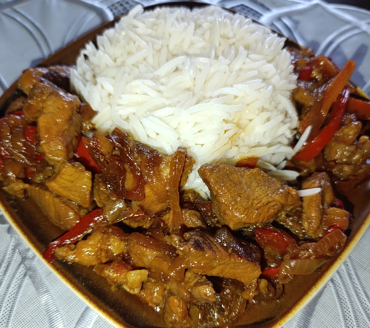 Очень вкусное, пряное, кисло-сладкое мясо!!! Оно понравится не только любителям тайской кухни. Конечно, при приготовлении идет специфический запах, но!!!! этот запах не имеет ничего общего с вкусом мяса!!!! Ингредиенты: мясо (любое) 700 гр перец болгарский 1 шт морковь 1 шт лук 1шт чеснок 3 зубчика соус соевый 5 ст л лимонный сок 2 ч л мед 3 ст л смесь перцев 0,5 ч л Мясо нарезаем небольшими полосками или кубиками, добавляем соевый соус, лимонный сок, мед, смесь перцев, измельченный чеснок. Перемешиваем. Маринуем 30 минут. Пока мясо маринуется нарезаем полосками перец, лук, морковь. Затем промаринованное мясо обжариваем без маринада на сковороде до легкой корочки. Достаем из сковороды мясо и на этой сковороде обжариваем овощи все сразу. Добавляем мясо и прожариваем все вместе минут 5. Наше мясо по-тайски готово!!!! Лучшим гарниром к нему будет рис. Приятного аппетита!!!