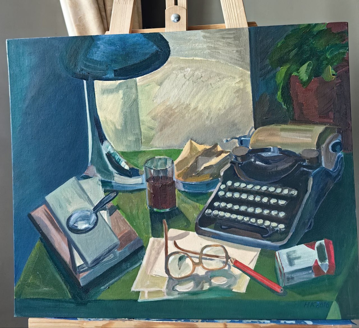 Натюрморт " рабочий стол писателя ", масло, холст на картоне,формат большой 50/60, 2016