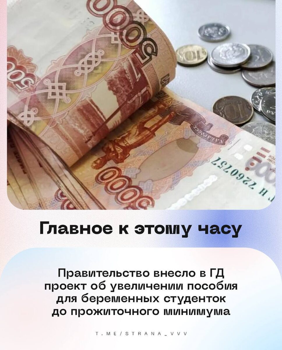 🇷🇺🇷🇺🇷🇺🇷🇺🇷🇺🇷🇺 на утро 24 мая: 🔹Правительство внесло в ГД проект об увеличении пособия для беременных студенток до прожиточного минимума. 🔹 Над регионами РФ за ночь и утро сбиты 94 украинских БПЛА, из них большинство над Белгородской областью, сообщили в Минобороны. 🔹Москалькова: освобожденных из плена жителей Курской области доставили в ПВР. 🔹Пенсионеры, достигшие 80 лет, инвалиды I группы и ряд других категорий граждан с 1 июня получат измененные соцвыплаты — член комитета СФ по социальной политике Косихина. 🔹 В ГД разработали законопроект о запрете мигрантам иметь больше одного номера телефона. 🔹Немкин: дипфейки в РФ используют в качестве инструмента информационных атак. 💰Курсы валют: доллар — 📉79,71; евро — 📈90,52; юань — 📈11,08. 🇷🇺 В Стране. Подписаться