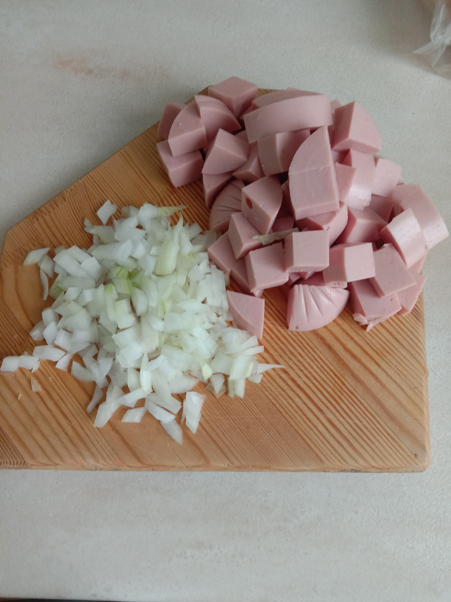Для приготовления нам понадобится 1. Сосиски, курица или колбаса 2. Картофель 5-6шт. 3. Сметана 2-3 ст. Ложки 4. Лук репчатый 1шт. 5. Яйцо 3шт. 6. Помидор 2-3шт. 7. Паприка, соль, перец по вкусу Нарезаем мясную составляющую и луковицу Разогреваем сковороду , закидываем лук и колбасу . Пока жарится чистим и нарезаем картофель Добавляем в сковороду картофель, посылаем паприкой, жирим минут 10 на высоком огне Пока обжаривается, разбиваем 3 яйца в ёмкость. Нарезаем помидоры добавляем. Соль перец по вкусу. И добавляем 2-3 ст.ложки сметаны Перемешиваем и заливаем в сковородку Убавляем огонь на минимум и тушим 20 минут под закрытой крышкой. Через 20 минут посыпаем натёртый сыром и обед готов Оставляем ещё на 10 минут. Приятного аппетита :)