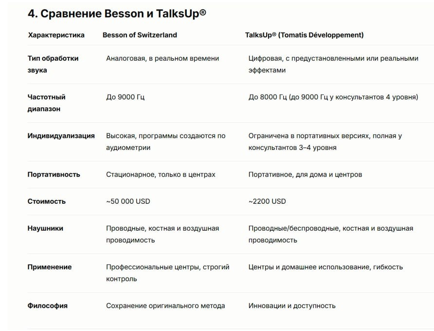Почему появились два метода Томатис: история раскола между Besson и Solisten/TalksUp Метод Томатиса сегодня представлен двумя основными направлениями: 1. Классический «Besson of Switzerland» (аналоговые аппараты, близкие к оригиналу Альфреда Томатиса Швейцария). 2. Цифровые системы «Tomatis Solisten» и «TalksUp» (разработаны после 2000-х годов производимого Tomatis Développement S.A., Франция/Люксембург). Эти ветви используют одну и ту же основу метода Томатис, но различаются в подходах к технологиям, реализации и философии. Ниже представлен обзор обоих подходов, причины их разделения и информация о возможных конфликтах между последователями. Разделение произошло из-за конфликта между наследниками идей Томатиса, различий в технологиях и бизнес-стратегиях. Смерть Альфреда Томатиса и борьба за наследие • Альфред Томатис умер в 2001 году. • После его смерти право на бренд и дальнейшее развитие метода перешло его сыну Кристиану Томатису. • Для управления правами был создан международн