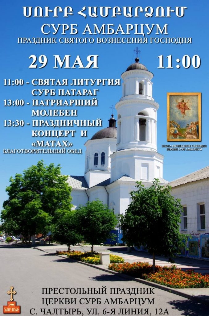 Это Господний праздник, который Армянская Апостольская Церковь в этом году отмечает 29 МАЯ, на сороковой день после Св. Пасхи, в период с 30-го апреля по 3-е июня, был утверждён Церковью в 4-5 веках. В основе праздника лежит повествование о том, как воскресший Христос призвал апостолов на Елеонскую гору и благословил их на всемирную проповедь: «Идите, научите все народы, крестя их во имя Отца и Сына и Духа Святого, уча их соблюдать все, что Я повелел вам; и се, Я с вами во все дни до скончания века. Аминь» (Мф. 28:19-20). С этими словами Он стал отдаляться, вознесся и скрылся в облаке и «воссел одесную Бога» (Мк. 16:19). Пока апостолы взирали на небо, явились два ангела и поведали о вознесении Христа, Который в свое время явится вновь для суда над человечеством и утверждения Царства Небесного. В этот день Армянская Церковь отмечает также перенесение Католикосата Всех Армян из города Сис в Первопрестольный Св. Эчмиадзин. Патриарший Престол, волею истории находивший пристанище в различны
