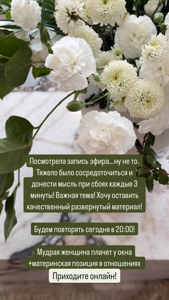 🥸 Я не договорила! Повтор эфира! Здравствуйте-здравствуйте! Вчера я проводила эфир «Мудрая женщина плачет у окна», но, к сожалению, из-за сильных перебоев связи мне пришлось его прервать. Я пересмотрела запись и поняла, что это совсем не то, что я хотела донести. Постоянные сбои мешали сосредоточиться и передать вам ту глубину и важность темы, которую я планировала. Но я не могу оставить это так! 📍 Поэтому сегодня в 20:00 по мск мы повторяем эфир. Еще раз! Что мы разберем: 💡 Почему многие женщины выбирают роль «мудрой», но при этом остаются несчастными. 💡 В чем разница между «мудрой» и «удобной» женщиной. 💡 Как мудрость может стать вашей силой, а не поводом для слез. 💡 И самое главное — как перестать быть той, кто плачет у окна, и начать жить в гармонии с собой. 👀 А также разберем материнскую позицию в отношениях и её влияние на вашу жизнь. Это отличная возможность для тех, кто вчера не смог присоединиться, но очень хотел. 📍Жду вас сегодня в 20:00 в моем блоге https://