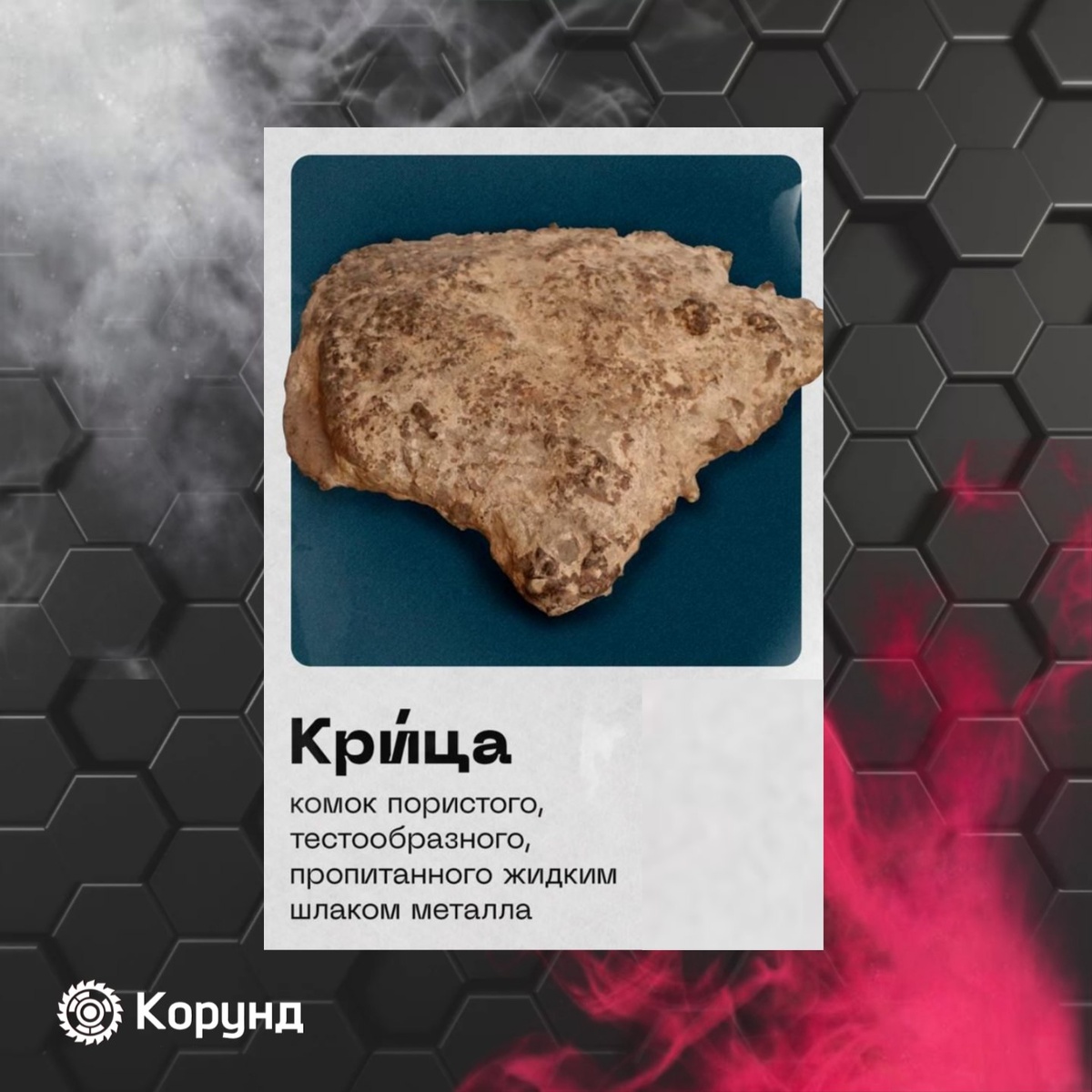 Знаете, как называли кузнецов в Древней Руси? «Кръч»! Именно это слово дало начало понятию «крица». Крицей в металлургии именуют продукт плавки железа в смеси со шлаком и несгоревшим углем. Такой комок получается в доменных печах с низкими температурами (до 1300 градусов по Цельсию). 1️⃣ понятие в копилочку КОРУНД | инструмент и оснастка