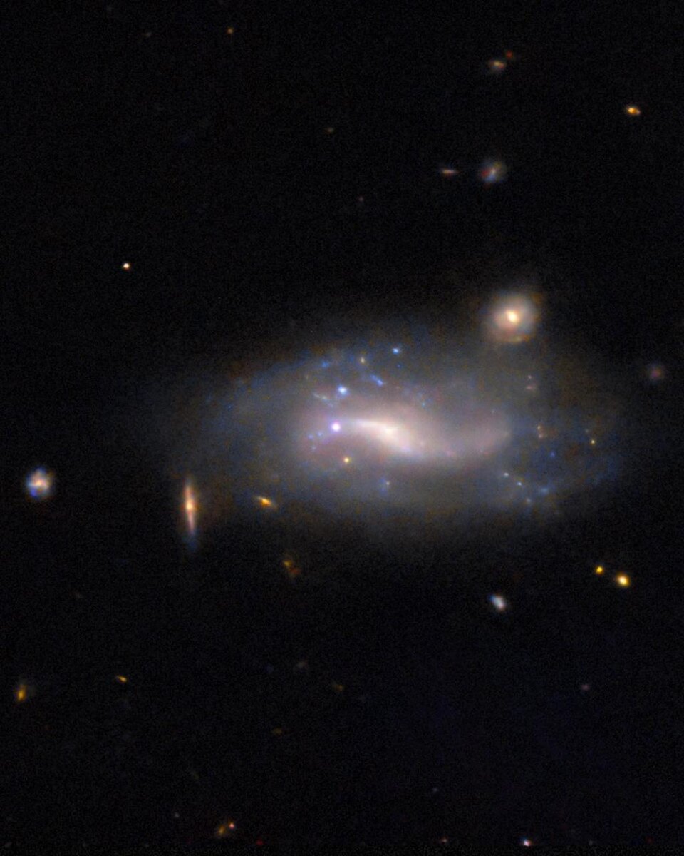 На этом изображении запечатлены сверхновая и её родительская галактика. Галактика LEDA 132905 расположена в созвездии Скульптора и находится на расстоянии более 400 миллионов световых лет от нас. Несмотря на такое большое расстояние, спиральная структура галактики слабо различима, а также видны участки ярких голубых звёзд. Яркая белая точка в центре изображения, между ярким ядром галактики и её слабым левым краем, - это сверхновая SN 2022abvt. Она была обнаружена в конце 2022 года, а космический телескоп Хаббл наблюдал взрыв примерно через два месяца после открытия. Это изображение составлено на основе данных, собранных для изучения сверхновых типа Ia.