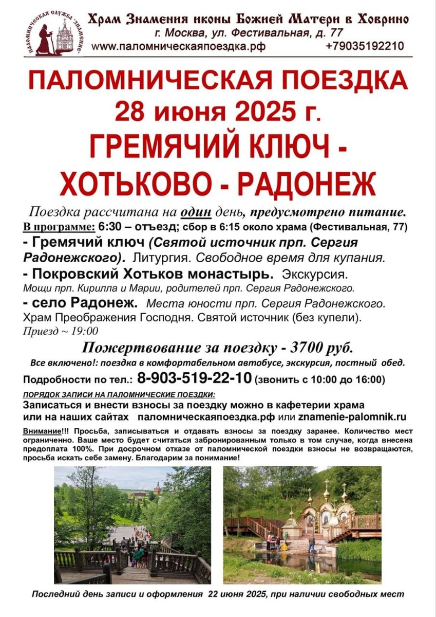 28 июня 2025 г. (в субботу) состоится паломническая поездка от Знаменского храма в Ховрино по маршруту Гремячий ключ - Хотьково - Радонеж (на 1 день + питание). Запись в кафетерии храма или на сайте https://паломническаяпоездка.рф Подробнее https://паломническаяпоездка.рф/index.php/sobytiya/79-novosti/680-