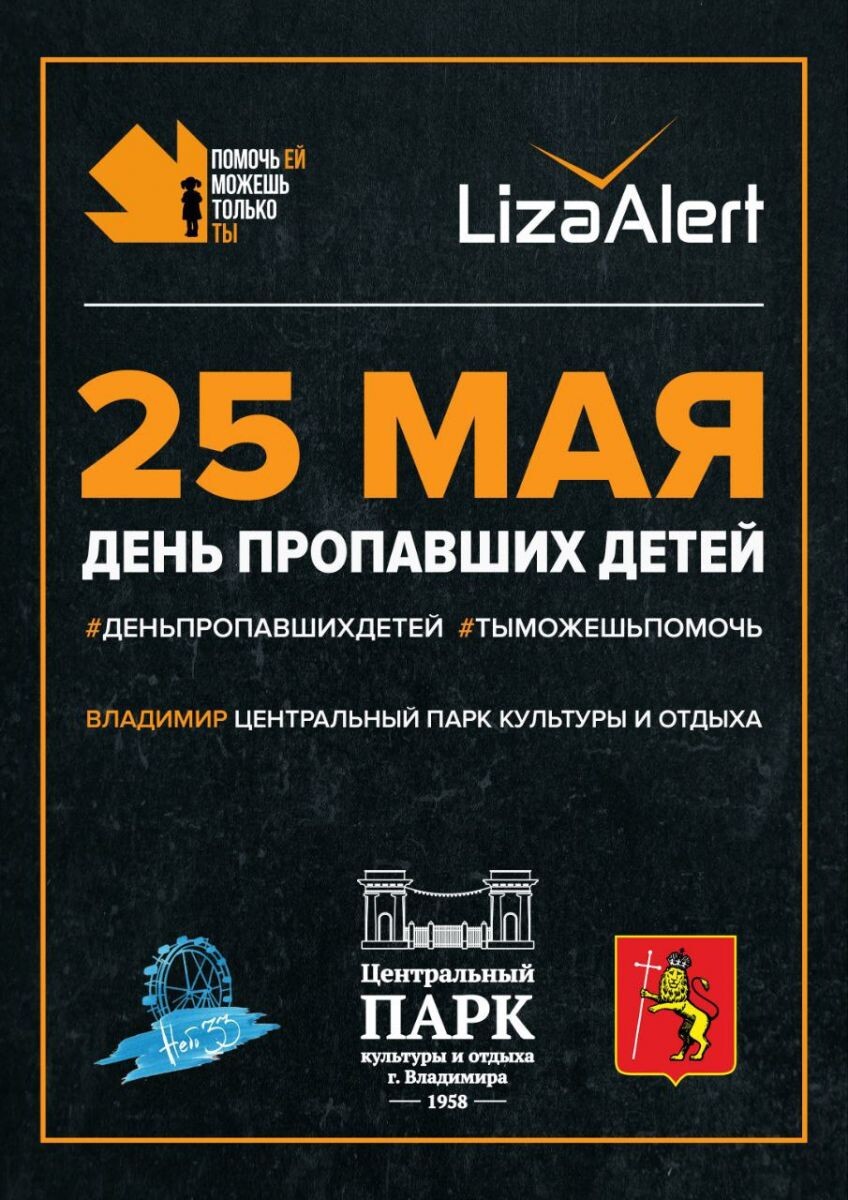 Администрация города Владимира сообщает. В Центральном парке культуры и отдыха областного центра поисковый отряд "ЛизаАлерт" 25 мая проводит акцию, чтобы привлечь внимание к проблеме исчезнувших без вести детей и вопросам их безопасности. К началу каникул, когда дети могут остаться без присмотра, это очень актуально. Каждый год акция проходит по всей стране в День пропавших детей 25 мая. Встреча с волонтерами, которые занимаются поиском детей, состоится с 12:00 до 14:00 в Центральном парке, возле колеса обозрения «Небо33».