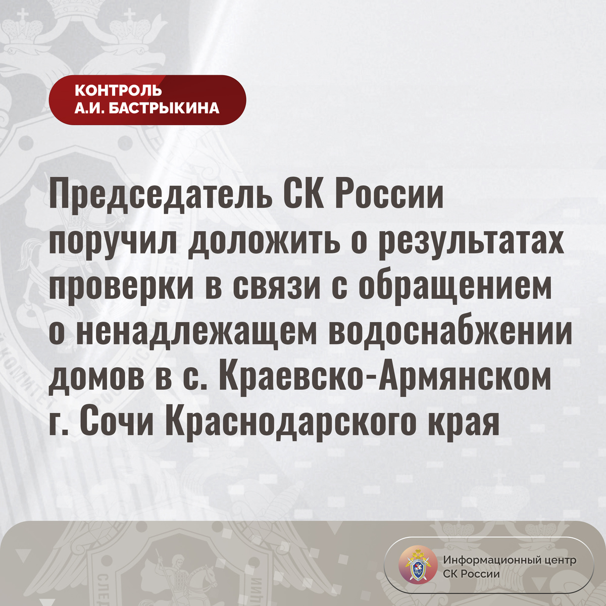 Председатель СК России поручил доложить о результатах проверки в связи с обращением о ненадлежащем водоснабжении домов в с. Краевско-Армянском г. Сочи Краснодарского края В Информационный центр СК России обратилась жительница Краснодарского края по вопросу продолжающегося нарушения прав жильцов ЖК «Измайловский парк» в селе Краевско-Армянском города Сочи. На протяжении трех лет в жилые помещения трех многоквартирных домов подается непригодная для потребления вода, не соответствующая санитарным нормам. При этом водоснабжение осуществляется с регулярными перебоями. Так, с июля прошлого года коммунальный ресурс не поступал в квартиры около месяца, аналогичное отключение произошло в январе текущего года. Многочисленные обращения граждан в компетентные органы результатов не принесли. Ранее А.И. Бастрыкин поручал представить доклад по указанной ситуации. В СУ СК России по Краснодарскому краю по данному факту проводилась процессуальная проверка. Председатель Следственного комитета Российской