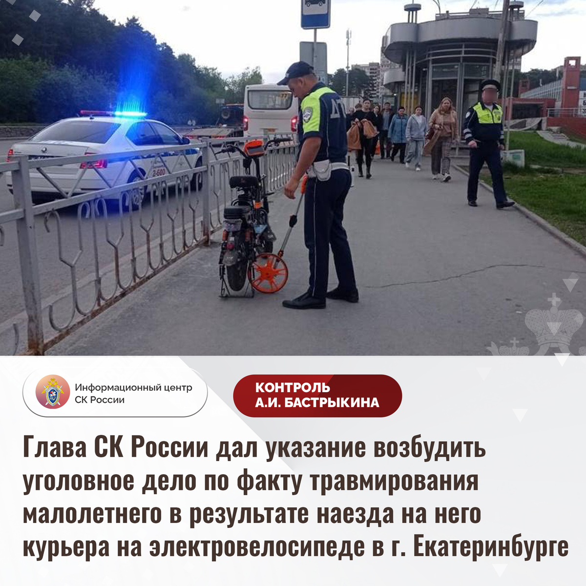 Глава СК России дал указание возбудить уголовное дело по факту травмирования малолетнего в результате наезда на него курьера на электровелосипеде в г. Екатеринбурге В сети Интернет сообщается, что 21 мая текущего года в городе Екатеринбурге курьер, управляя электровелосипедом без водительского удостоверения, сбил четырехлетнего мальчика в пешеходной зоне. Пострадавший доставлен в медицинское учреждение. В СУ СК России по Свердловской области по данному факту организована процессуальная проверка. Председатель Следственного комитета Российской Федерации Александр Иванович Бастрыкин дал указание руководителю СУ СК России по Свердловской области Богдану Валерьевичу Францишко возбудить уголовное дело и представить доклад о ходе и результатах его расследования. Исполнение поручения поставлено на контроль в центральном аппарате ведомства. #СледственныйКомитет #СКРоссии #СКР #ИЦСКР #ИнформационныйЦентр #АлександрБастрыкин #ПредседательСКР #КонтрольПредседателяСКР #КомментарийКонтроль #Свердлов